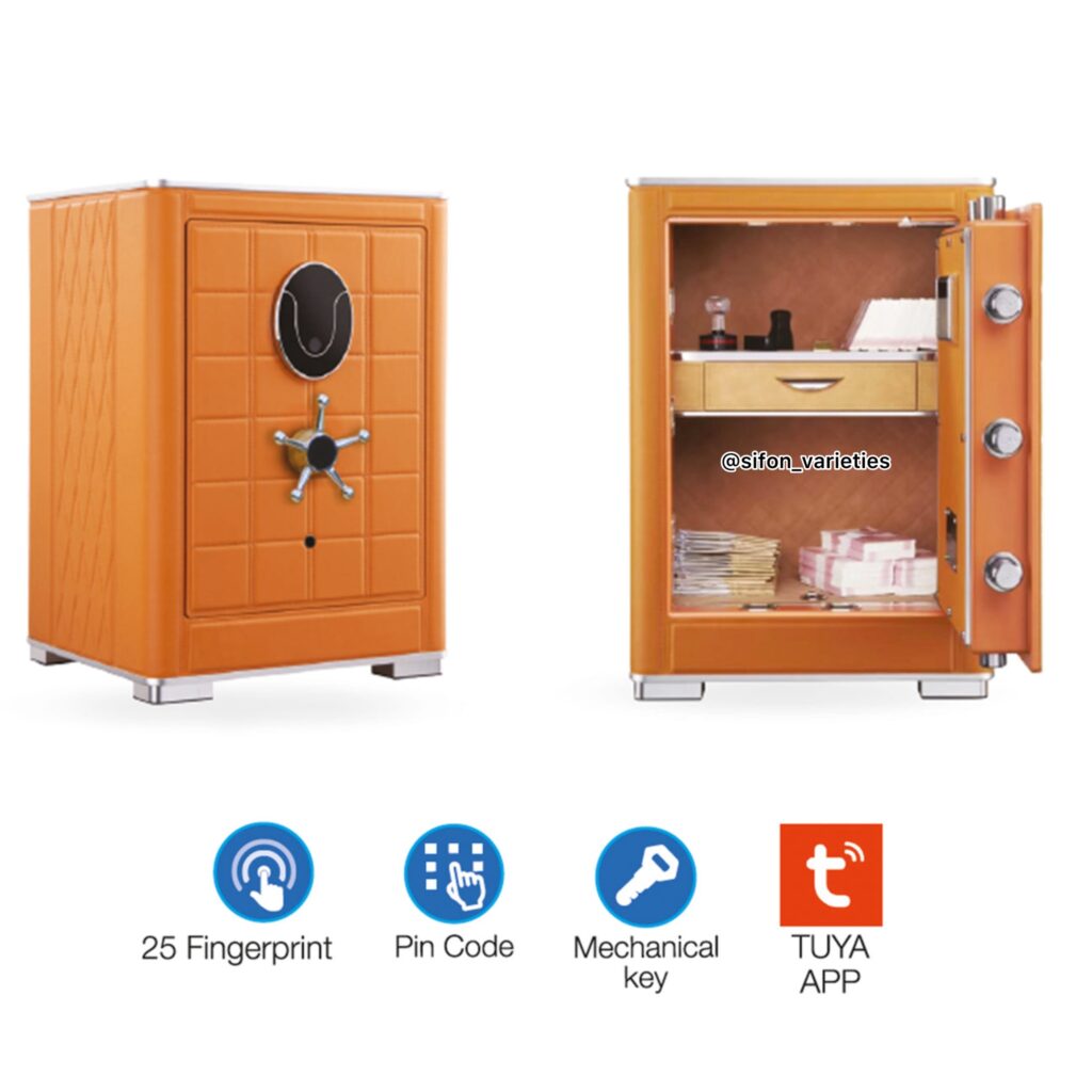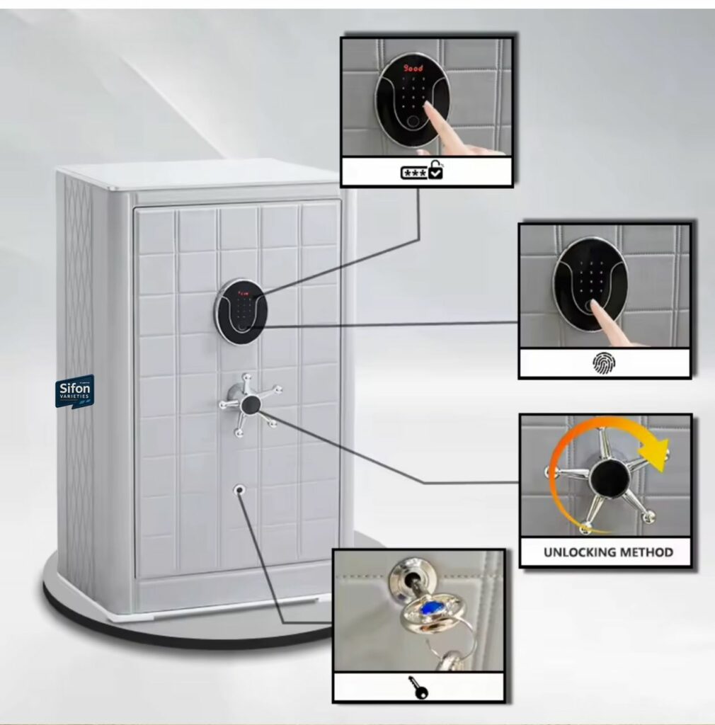Design: The safe has a distinctive  leather-textured exterior with a stylish handle and robust locking bolts.